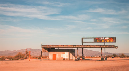 Abandoned gas station in the desert of California, USA. Vintage filter applied.