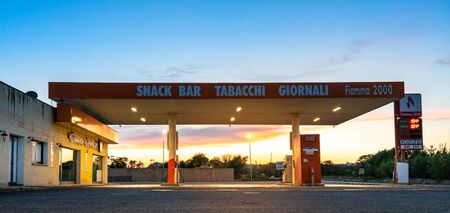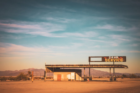 Old abandoned gas station in the desert at sunset, vintage filter effect.