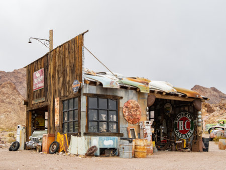 Nevada, MAR 13, 2021 - Abandoned car repair shop of the Nelson Ghost Town