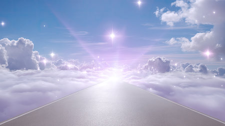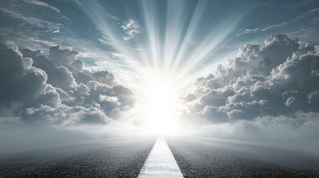 A mesmerizing pathway stretches into a luminous horizon filled with fluffy clouds and radiant light, evoking a sense of freedom and dreamy exploration.