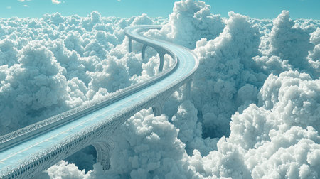 A stunning ethereal bridge winds gracefully through fluffy clouds, creating a dreamlike atmosphere. This scenic view invites exploration and wonder.