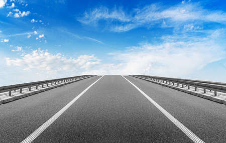 Open road stretches into the distance, bordered by fluffy clouds in a blue sky. A perfect scene for travel and exploration photography.