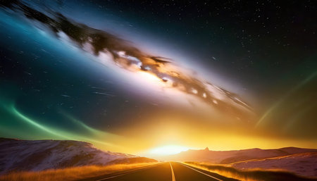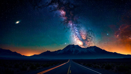 Generative AI : A road leading to distance in a mountain valley with milky way in the backgroung