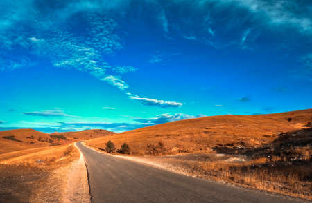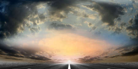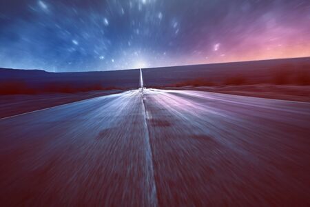 Country road background and colorful sunset landscape..Car travelling and scenic desert road.Adventures and destination concept.
