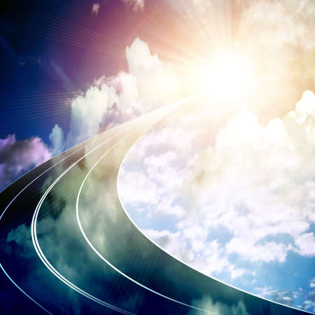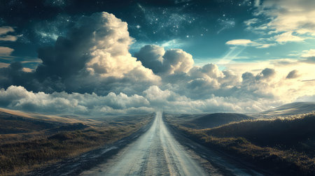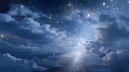 Surreal road floating in the sky, surrounded by clouds and stars, magical path to another world, dreamlike atmosphere