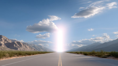 A stunning view of desert highway stretching into distance, illuminated by bright light at horizon, surrounded by mountains and clear blue sky, evoking sense of wonder and adventure