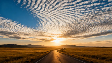 A captivating image of an empty road stretching towards a stunning sunset with a vibrant sky above and majestic mountains in the background, evoking a sense of adventure.