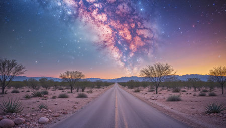 AI Generated. Stunning Nighttime Desert Road Under The Milky Way Galaxy