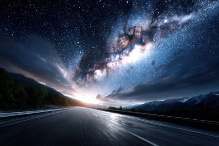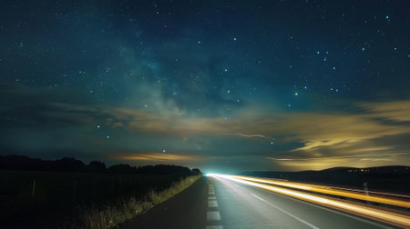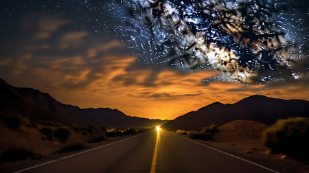 Generative AI : Night sky with milky way and stars Night road illuminated by car Light trails