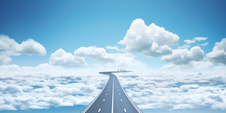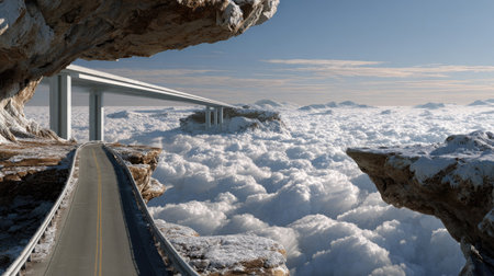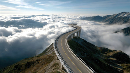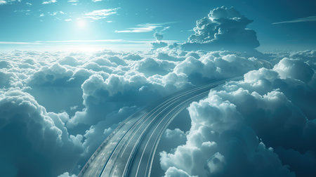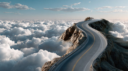 A captivating view of a winding road perched above a sea of fluffy clouds under a bright sky, offering a serene and dreamlike journey in nature.