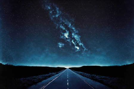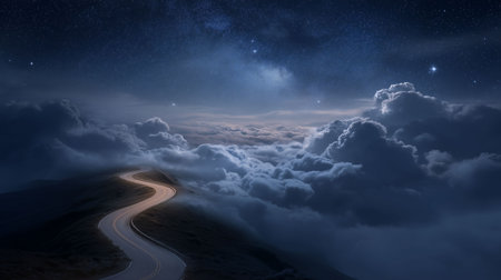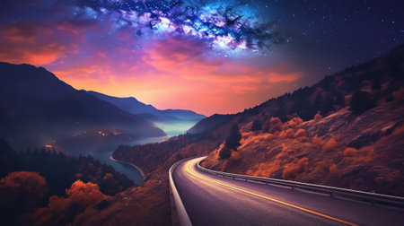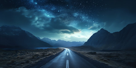 Winding road under a starry night sky, tranquil landscape. Exploration and adventure concept