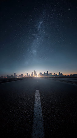 Long asphalt road leading to a city skyline under a starry night sky, with a visible Milky Way. Light streaks the horizon, highlighting the buildings.