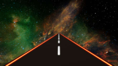 Floating ribbon-like highway is twisting through cosmic nebula, in flat design with dashed lanes. Futuristic, surreal, abstract, sci-fi, minimalist, cosmic, navigational