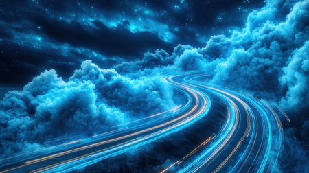 An ethereal scene featuring a surreal cloud formation hovering above a deserted highway. The atmospheric perspective creates a captivating visual experience.