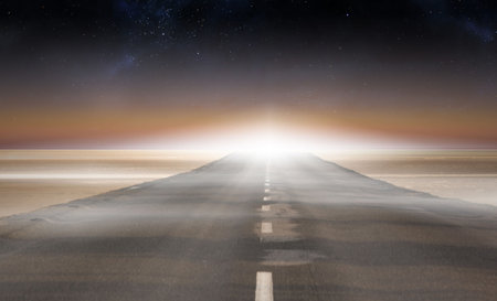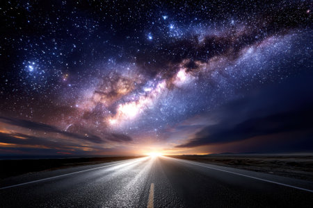This stunning image captures a tranquil road at night, leading towards a bright horizon under a mesmerizing starry sky. Perfect for evoking themes of adventure.