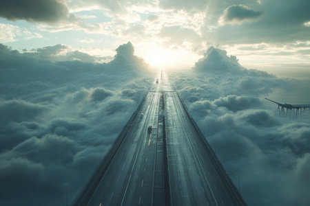 A road appears to be slicing through the clouds in the sky above, creating a surreal and dreamlike scene
