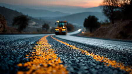 Newly laid asphalt road during golden hour with construction machinery distant view