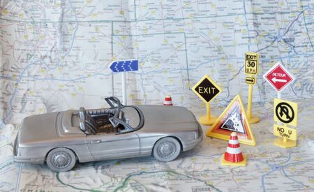 Abstract road construction with signs, car on a map