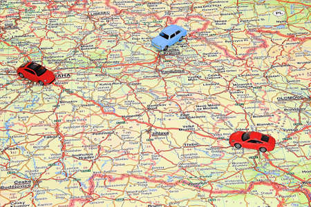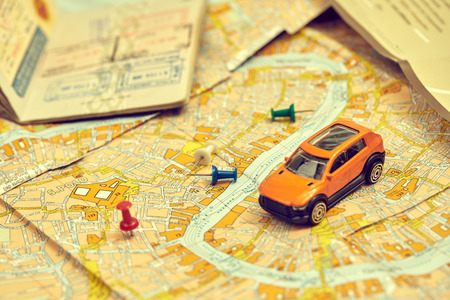 Travel concept - small toy car on the map