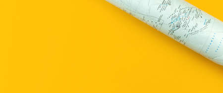 World map on the table, flat lay composition and yellow desktop background, top view and copy space