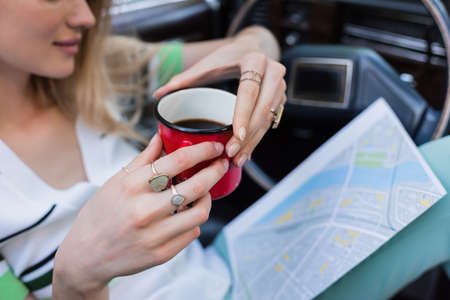 cropped view of young woman holding cup of coffee and looking at road map in car on blurred background