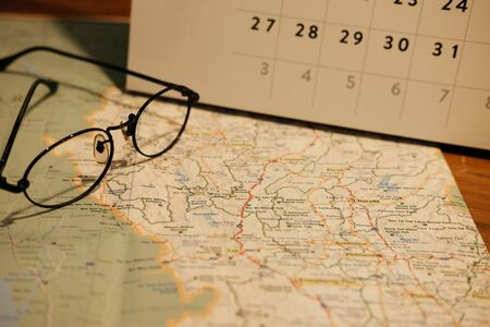 warm tone. calendar and glasses placed on top of travel map. on wooden table. this image for travel,accessory,fashion,business concept