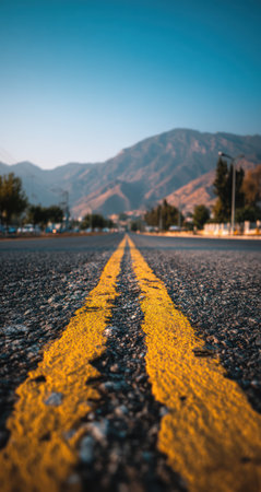 An asphalt road with yellow lines stretches towards distant mountains under a clear blue sky. The composition features a shallow depth of field, with the foreground in focus. The scene suggests a daytime setting with natural lighting. This image could be used for travel, transportation, or landscape related projects.