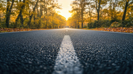 Enjoy the serene beauty of a smooth asphalt road surrounded by autumn foliage, perfect for conveying peace and tranquility in a landscape setting.