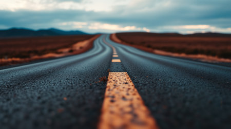 A stunning low-angle view of a highway at dusk, with vibrant yellow lines and soft glow of city lights, creating a serene yet captivating atmosphere.
