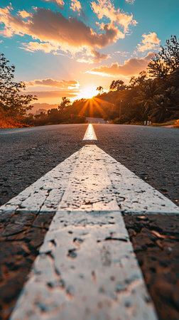 An asphalt road stretches into the distance, framed by trees under a sunset. The composition features a central yellow line. The sky transitions from orange to blue. The style evokes a sense of journey and tranquility, suitable for various editorial and commercial applications.