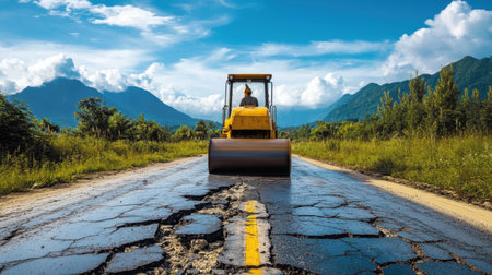 A heavy roller is actively repairing a damaged road with visible cracks, surrounded by scenic mountains and a bright blue sky, showcasing infrastructure work.