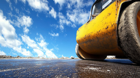A close-up view of a yellow road roller on a newly paved road, showcasing its powerful wheels on smooth asphalt under a vibrant blue sky.