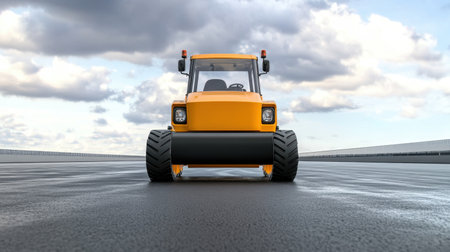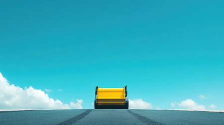 A asphalt roller is rolling black top-blue in the center of an empty road, creating new pavement. The yellow machine should be visible from above and its wheels must rest on fresh hot paint asphalt. In front there's space for mekotarsis to place their logo or text. This photo will make it easy to add your brand or company name into the scene. It can help you showcase high-quality concrete roller work during construction or pavements at outdoors. --chaos 30 --ar 16:9 --v 6.1 Job ID: f5dd73e0-9ee7-4f47-8da8-cc31b6206f11