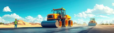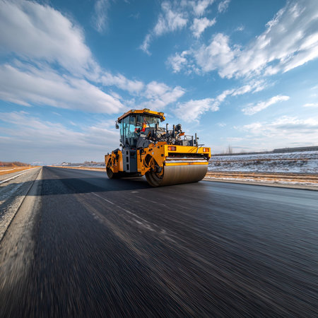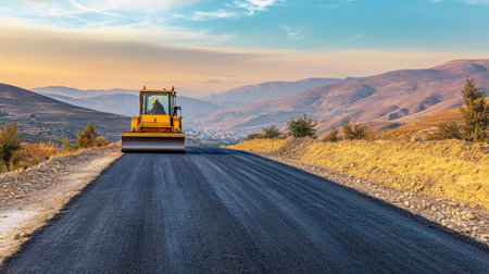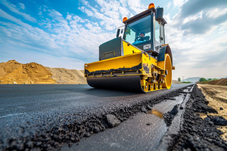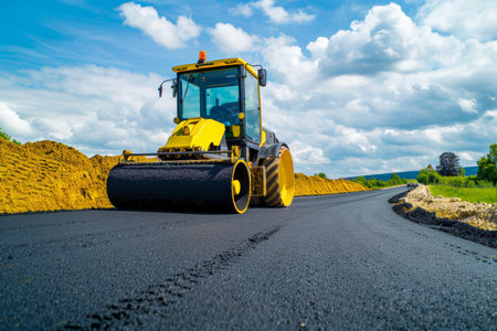A heavy machinery roller works efficiently on a freshly laid asphalt road, showcasing the smooth surface under a bright sun, symbolizing modern infrastructure development.