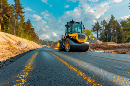 Yellow road roller compacting fresh asphalt on newly constructed road for enhanced durability