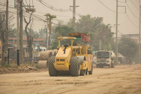 Chiangmai, Thailand - March 12 2020: Sakai road roller on Construction site. Photo of new road no.121 outside ring road of chiangmai city.