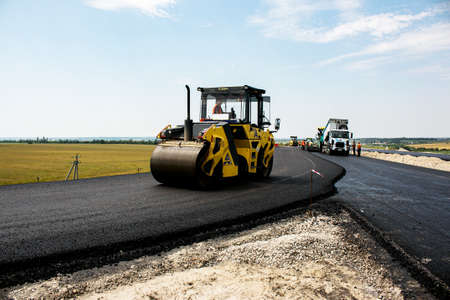 Road roller compacting fresh asphalt on a new highway during sunny afternoon