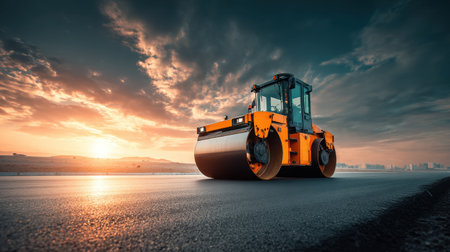 A steamroller efficiently paves an asphalt road under a stunning sunset sky, highlighting the blend of technology and nature in construction work.