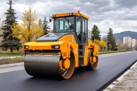An asphalt roller in action, paving a new road, with fresh black asphalt being compressed under its heavy wheels. High quality photo