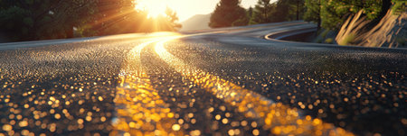 An asphalt road extends into the distance, framed by hills and illuminated by a setting sun. The composition features a low-angle perspective, highlighting the road's texture and the natural gradient of the sky. The warm colors suggest a tranquil outdoor setting, suitable for commercial or editorial applications.