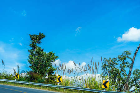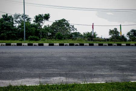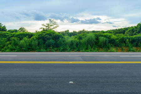 Blur background of gray asphalt road in a peaceful rural area on a sunny day and clear blue sky clouds. There are white border and yellow central line. The roadside is brown, grass, and green trees.