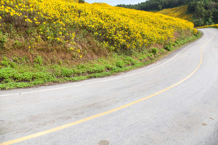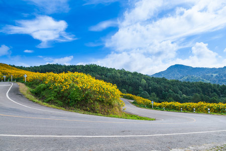 Curve road on the hill with flowers by the roadside. Front of the mountains and forests