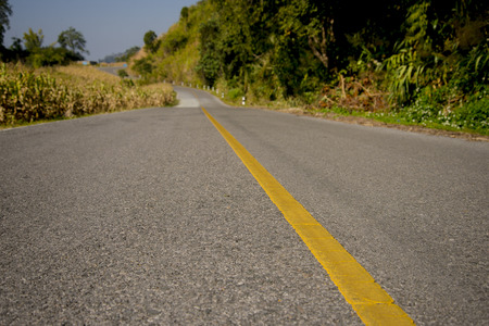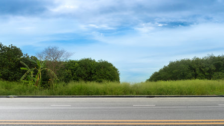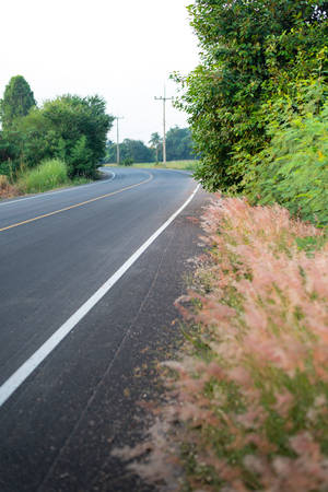Horizontal view of asphalt road in Thailand. Background is grass and trees that grow thickly.