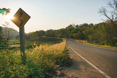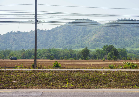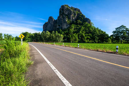 country road side, curve road along corn field and fence with mountain scenery in country side, Thailand