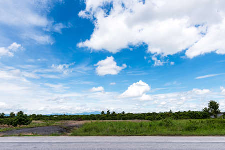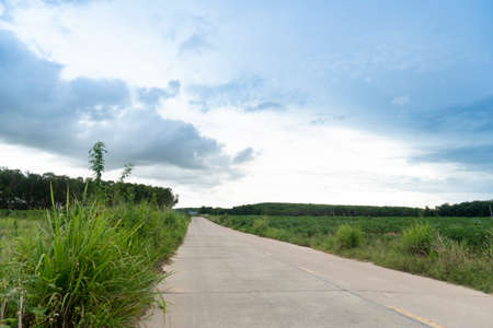 Road ahead of the concrete road. Beside with green grass. and Young seedlings of cassava fields and rubber trees. Under the sky.