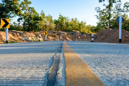 Paved road curve on mountains.Road dividing line.The road to the mountain.The asphalt road on both sides of the road is covered with grass.