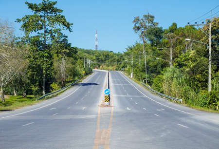 Long straight asphalt road ahead. With trees forest two beside and electric pole. long white line and yellow dotted line on the road. Cross-provincial area.