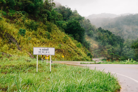 Beautiful foggy road through the forest at daytime, asphalt road on the mountain with foggy in rainy season