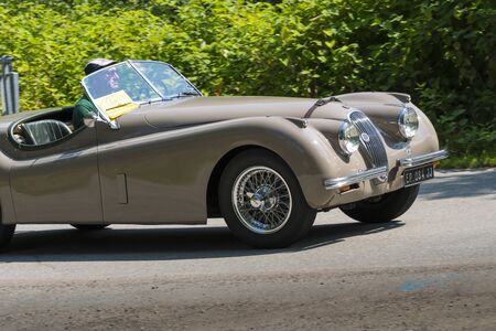Valsesia, Italy - June 30, 2019: Classic car, a vintage Jaguar during a meeting for historic cars.