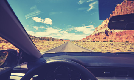 Vintage toned photo of a road taken from the front seat of a car, travel concept, USA.